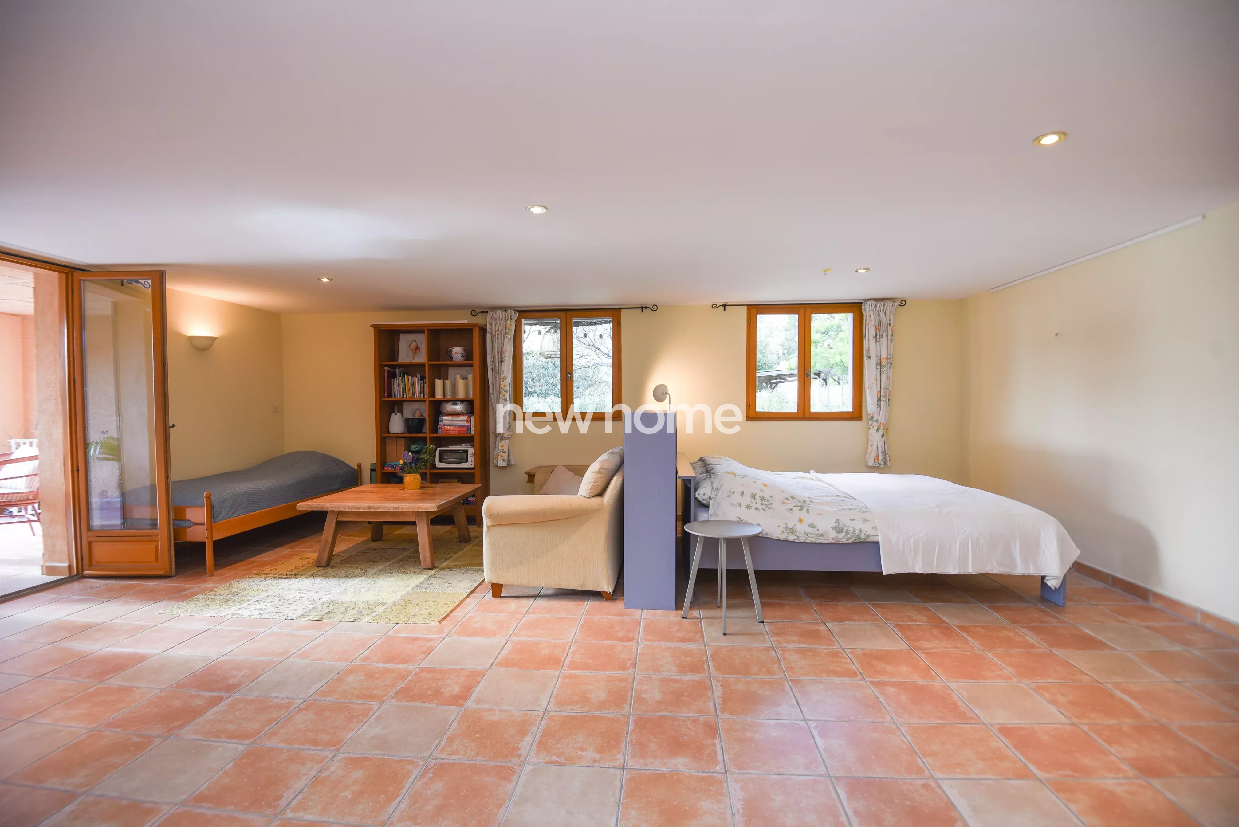 En rez-de-chaussée, un spacieux studio de plus de 35 m² avec salle d'eau constitue un espace idéal pour recevoir famille ou invités en toute indépendance. De larges ouvertures donnent accès au jardin et à une grande terrasse couverte exposée Sud-Ouest.