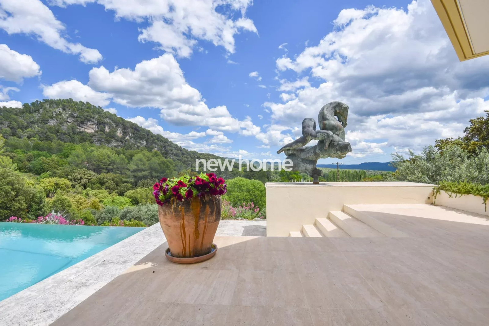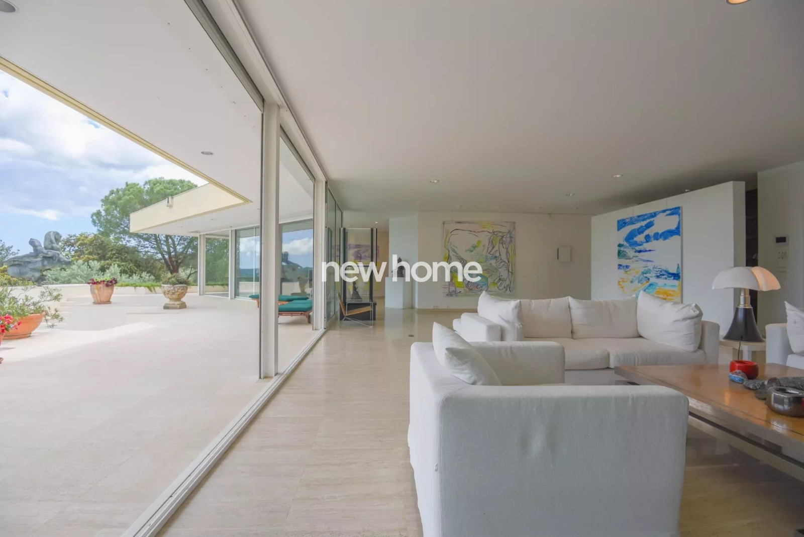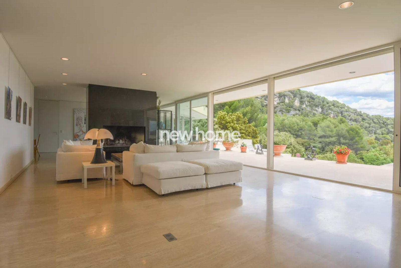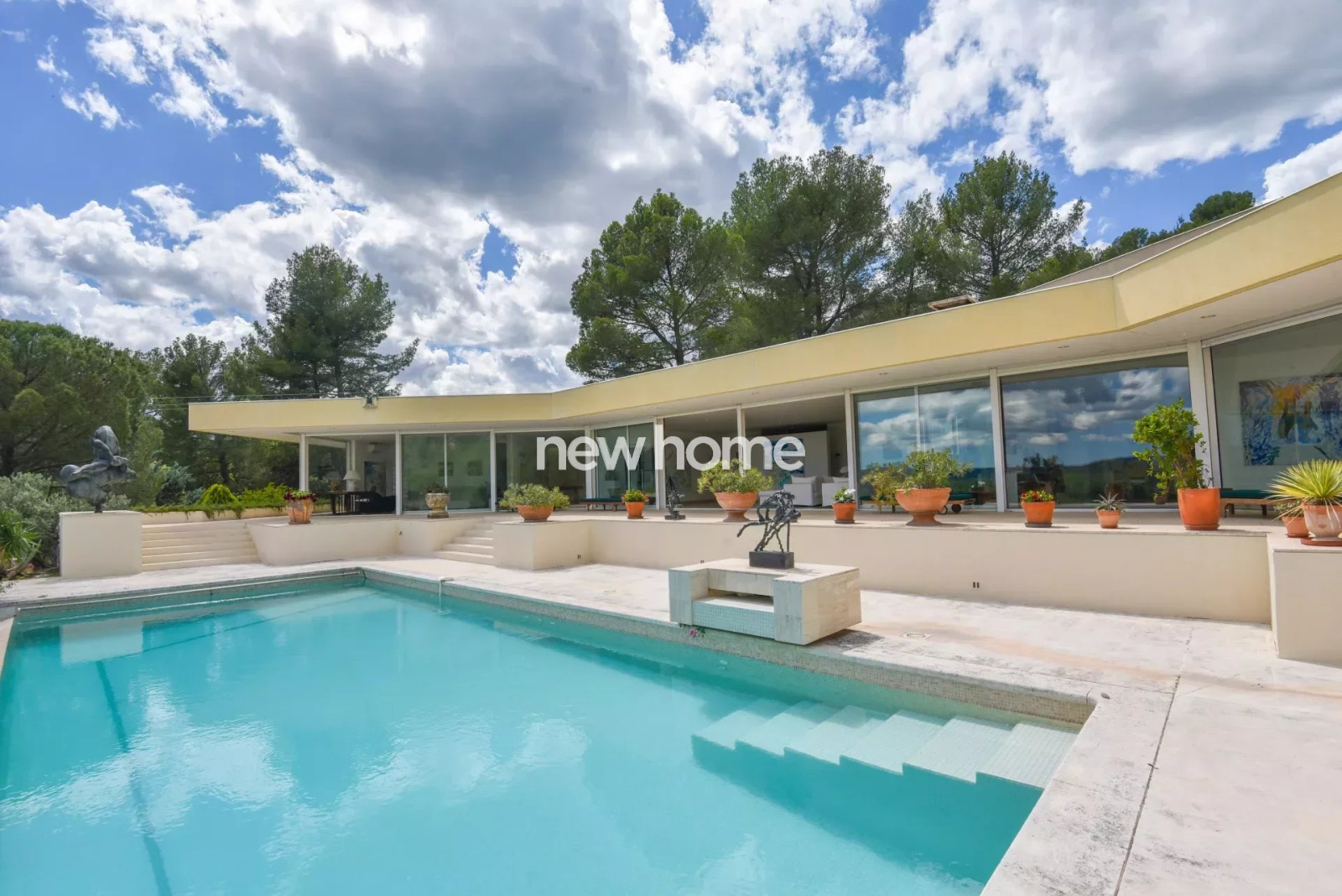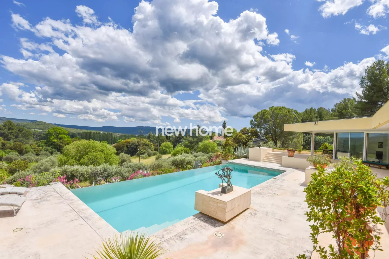 Magnifique domaine situé entre la Méditerranée et le Verdon, niché au coeur d'une zone naturelle protégée, à seulement 2 km du centre du village. L'aéroport de Nice est à 1h30 en voiture, tandis que Draguignan, avec sa gare TGV, n'est qu'à 30 minutes. Un petit chemin serpente à travers une vallée classée en tant que zone naturelle protégée, menant à l'entrée de la maison, située au bout du chemin. D'Est en Ouest, le panorama offre une vue imprenable sur les collines. La conception de la maison suit harmonieusement la pente naturelle de la colline, avec ses fondations directement ancrées dans la roche. Protégée à l'arrière par une ceinture rocheuse, la villa embrasse pleinement le panorama environnant. Conçue dans un esprit moderniste par l'architecte américain A. Krikhaar, la villa et sa maison d'amis s'étendent sur un terrain ensoleillé de 1,74 hectare, avec environ 610 m² de surface habitable de plain-pied, ainsi qu'un atelier spacieux situé au-dessus des garages. La maison met en valeur des volumes ouverts et des matériaux contemporains tels que l'acier, le béton et le verre. L'entrée donne accès à un salon spacieux et lumineux offrant une vue d'ensemble sur les différents espaces intérieurs et extérieurs. Les fenêtres s'étendent sur toute la longueur de la façade sud, créant une transition fluide entre les espaces et offrant une vue panoramique sur l'extérieur à couper le souffle. Une grande cheminée, recouverte de carreaux de granit brésilien vert foncé, divise subtilement l'espace entre le salon et la zone bureau et bibliothèque. À l'extrémité Est se trouve une grande chambre avec salle de bains privative et dressing. Un couloir mène à l'arrière de la maison, où se trouve un garage triple. Un escalier mène à l'atelier d'artiste et à une mezzanine donnant sur la terrasse sur le toit. À l'Est, la cuisine s'ouvre sur une terrasse extérieure, tandis qu'à l'Ouest, un couloir mène à deux chambres supplémentaires avec salles de bains privatives, ainsi qu'à une salle d'exposition éclairée par un puits de lumière central. Les sols en travertin romain, les plafonds en lamelles métalliques coulissantes et les grandes portes en verre sablé complètent l'harmonie de l'ensemble. La maison d'amis ou de gardien, attenant à la villa, comprend un salon, une cuisine ouverte, deux chambres, une salle de bains et des toilettes séparées, ainsi qu'une terrasse privée. Le jardin en terrasses descend jusqu'à une magnifique piscine à débordement offrant une vue imprenable.