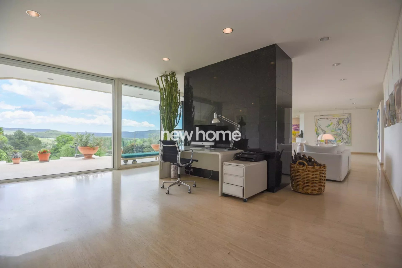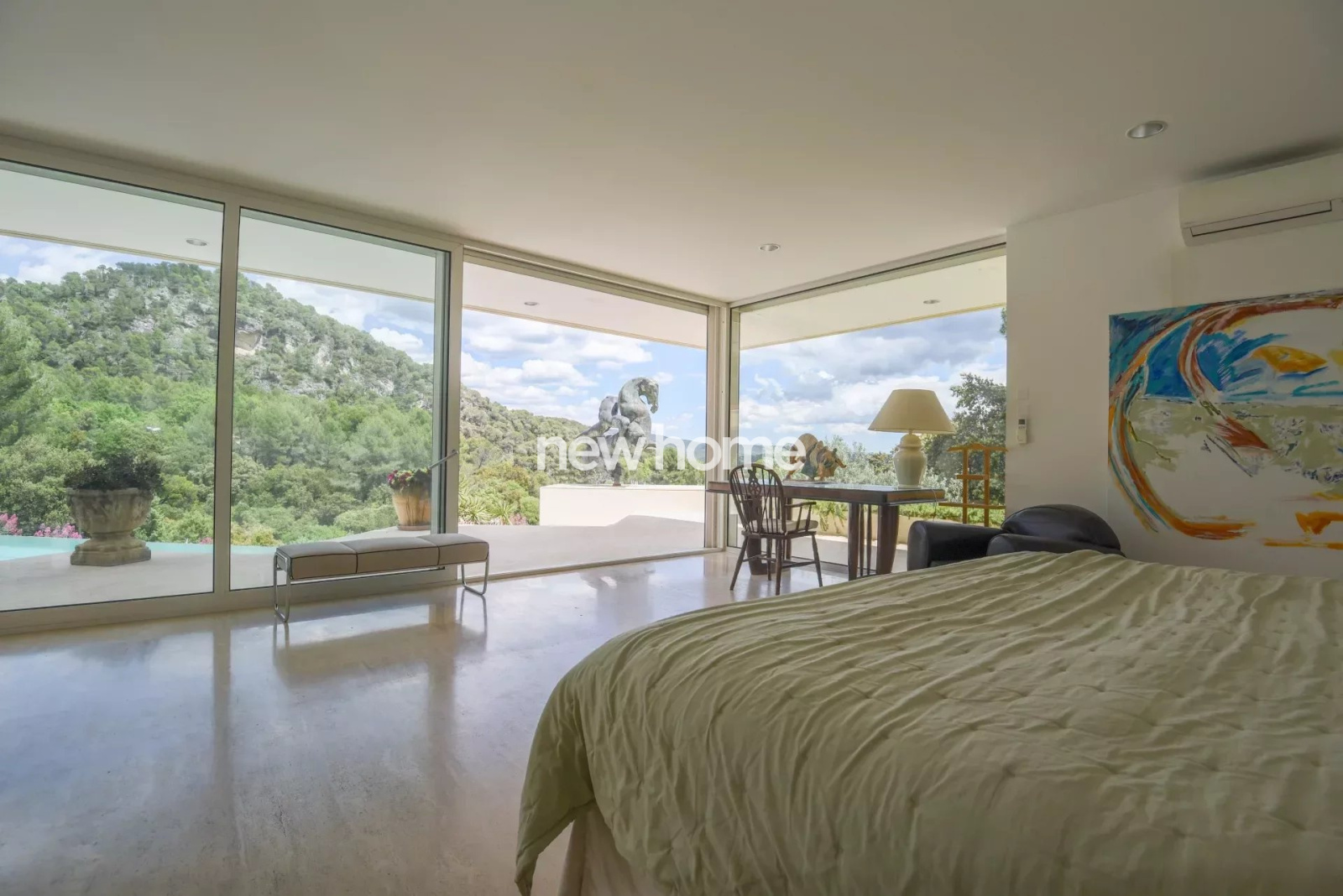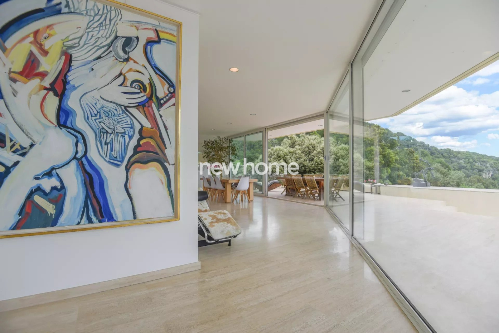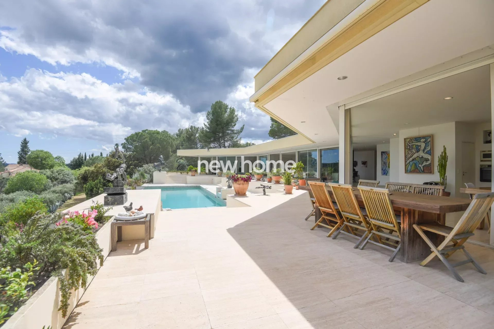 Magnifique domaine situé entre la Méditerranée et le Verdon, niché au coeur d'une zone naturelle protégée, à seulement 2 km du centre du village. L'aéroport de Nice est à 1h30 en voiture, tandis que Draguignan, avec sa gare TGV, n'est qu'à 30 minutes. Un petit chemin serpente à travers une vallée classée en tant que zone naturelle protégée, menant à l'entrée de la maison, située au bout du chemin. D'Est en Ouest, le panorama offre une vue imprenable sur les collines. La conception de la maison suit harmonieusement la pente naturelle de la colline, avec ses fondations directement ancrées dans la roche. Protégée à l'arrière par une ceinture rocheuse, la villa embrasse pleinement le panorama environnant. Conçue dans un esprit moderniste par l'architecte américain A. Krikhaar, la villa et sa maison d'amis s'étendent sur un terrain ensoleillé de 1,74 hectare, avec environ 610 m² de surface habitable de plain-pied, ainsi qu'un atelier spacieux situé au-dessus des garages. La maison met en valeur des volumes ouverts et des matériaux contemporains tels que l'acier, le béton et le verre. L'entrée donne accès à un salon spacieux et lumineux offrant une vue d'ensemble sur les différents espaces intérieurs et extérieurs. Les fenêtres s'étendent sur toute la longueur de la façade sud, créant une transition fluide entre les espaces et offrant une vue panoramique sur l'extérieur à couper le souffle. Une grande cheminée, recouverte de carreaux de granit brésilien vert foncé, divise subtilement l'espace entre le salon et la zone bureau et bibliothèque. À l'extrémité Est se trouve une grande chambre avec salle de bains privative et dressing. Un couloir mène à l'arrière de la maison, où se trouve un garage triple. Un escalier mène à l'atelier d'artiste et à une mezzanine donnant sur la terrasse sur le toit. À l'Est, la cuisine s'ouvre sur une terrasse extérieure, tandis qu'à l'Ouest, un couloir mène à deux chambres supplémentaires avec salles de bains privatives, ainsi qu'à une salle d'exposition éclairée par un puits de lumière central. Les sols en travertin romain, les plafonds en lamelles métalliques coulissantes et les grandes portes en verre sablé complètent l'harmonie de l'ensemble. La maison d'amis ou de gardien, attenant à la villa, comprend un salon, une cuisine ouverte, deux chambres, une salle de bains et des toilettes séparées, ainsi qu'une terrasse privée. Le jardin en terrasses descend jusqu'à une magnifique piscine à débordement offrant une vue imprenable.