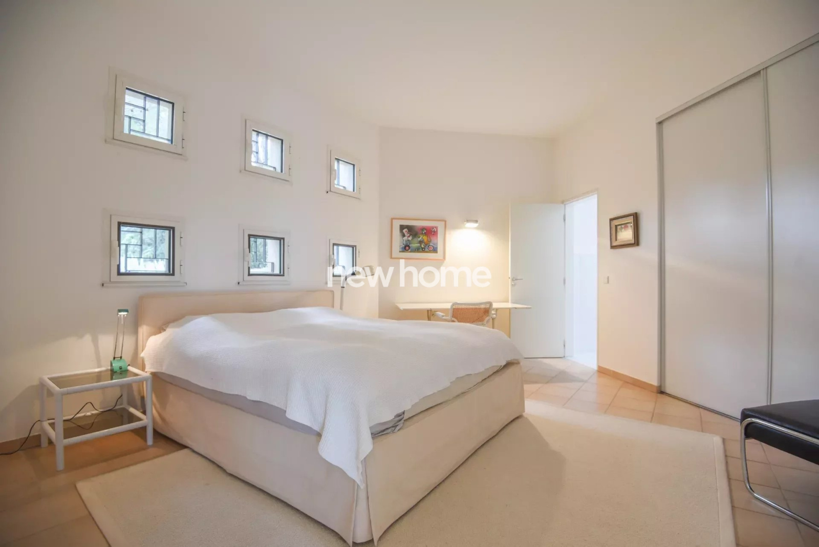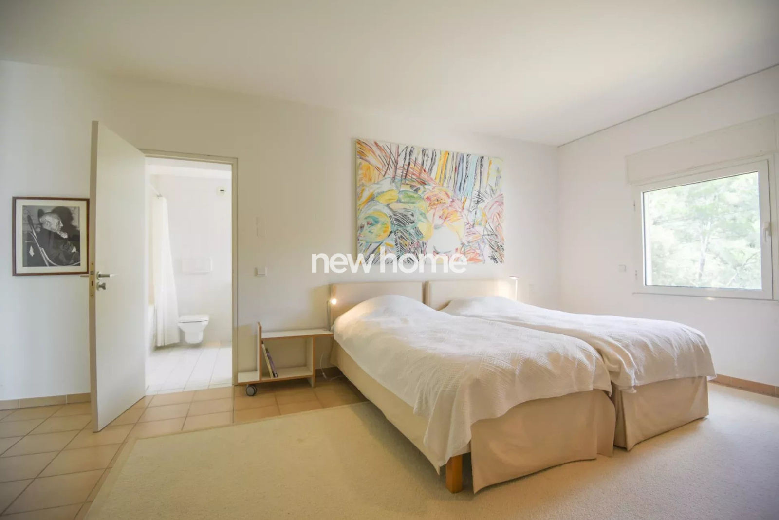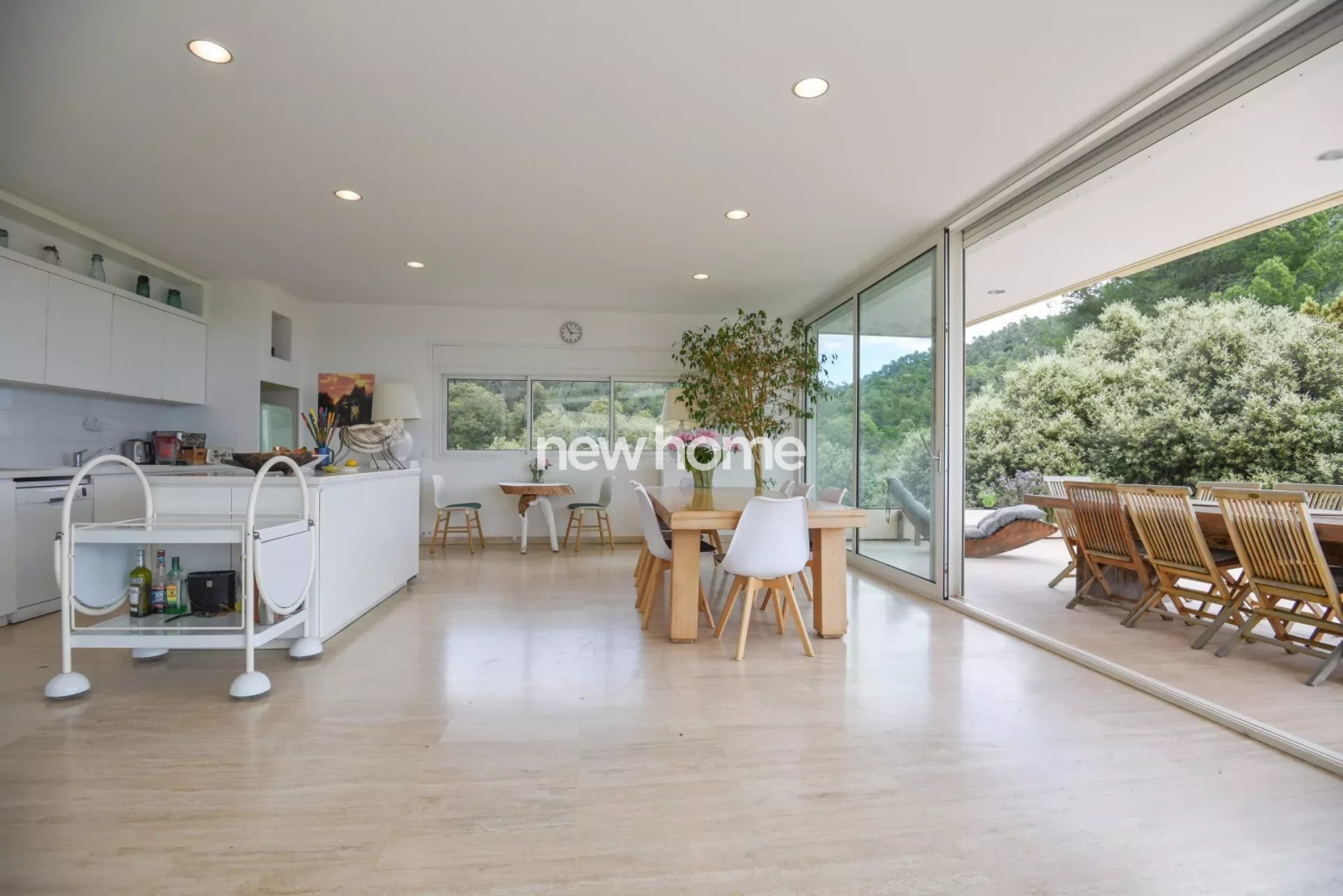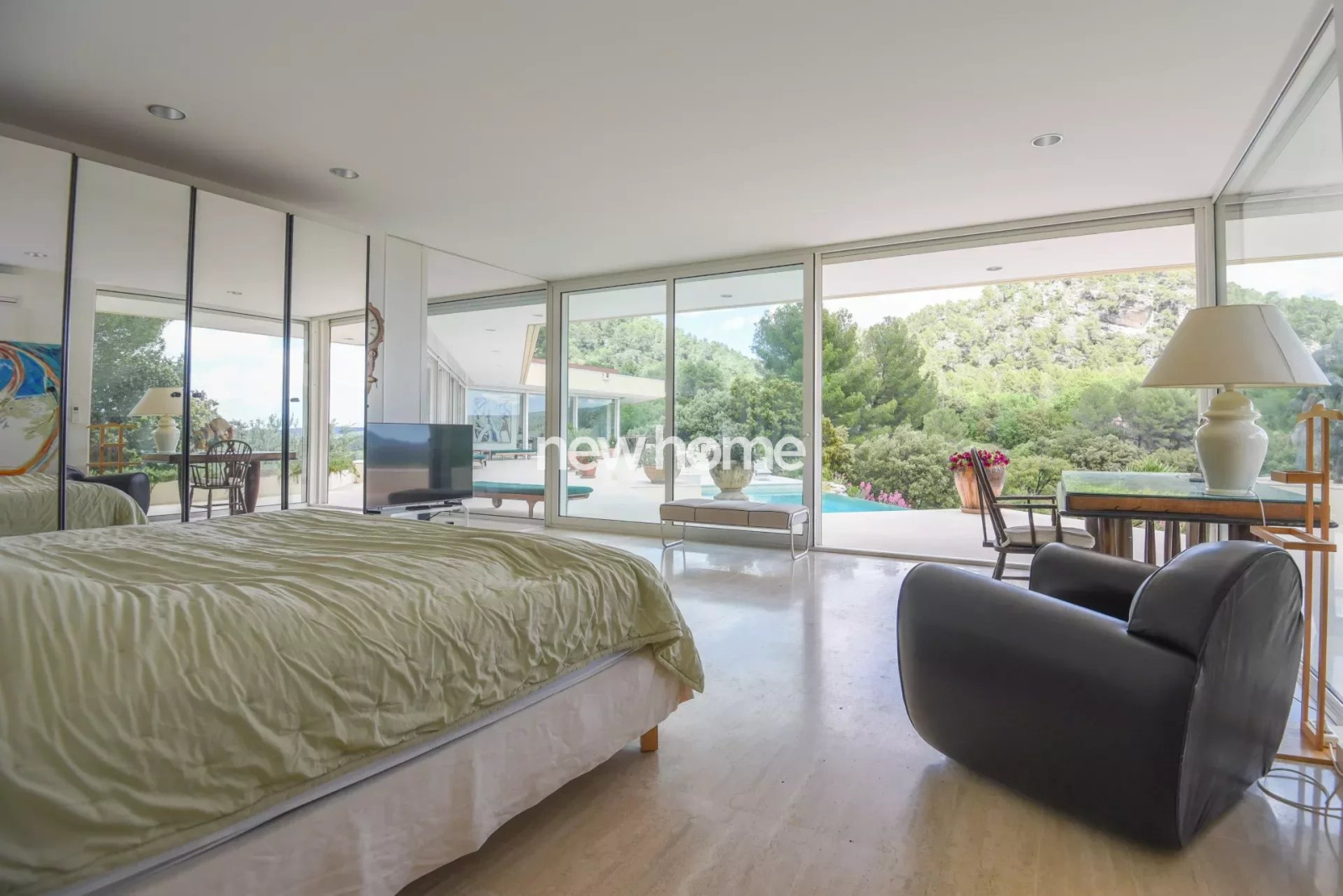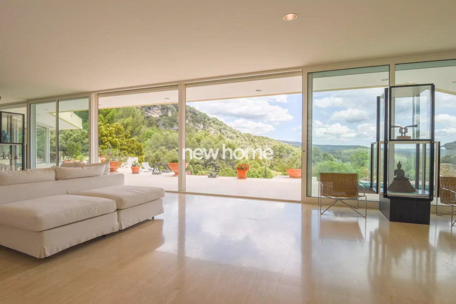Magnifique domaine situé entre la Méditerranée et le Verdon, niché au coeur d'une zone naturelle protégée, à seulement 2 km du centre du village. L'aéroport de Nice est à 1h30 en voiture, tandis que Draguignan, avec sa gare TGV, n'est qu'à 30 minutes. Un petit chemin serpente à travers une vallée classée en tant que zone naturelle protégée, menant à l'entrée de la maison, située au bout du chemin. D'Est en Ouest, le panorama offre une vue imprenable sur les collines. La conception de la maison suit harmonieusement la pente naturelle de la colline, avec ses fondations directement ancrées dans la roche. Protégée à l'arrière par une ceinture rocheuse, la villa embrasse pleinement le panorama environnant. Conçue dans un esprit moderniste par l'architecte américain A. Krikhaar, la villa et sa maison d'amis s'étendent sur un terrain ensoleillé de 1,74 hectare, avec environ 610 m² de surface habitable de plain-pied, ainsi qu'un atelier spacieux situé au-dessus des garages. La maison met en valeur des volumes ouverts et des matériaux contemporains tels que l'acier, le béton et le verre. L'entrée donne accès à un salon spacieux et lumineux offrant une vue d'ensemble sur les différents espaces intérieurs et extérieurs. Les fenêtres s'étendent sur toute la longueur de la façade sud, créant une transition fluide entre les espaces et offrant une vue panoramique sur l'extérieur à couper le souffle. Une grande cheminée, recouverte de carreaux de granit brésilien vert foncé, divise subtilement l'espace entre le salon et la zone bureau et bibliothèque. À l'extrémité Est se trouve une grande chambre avec salle de bains privative et dressing. Un couloir mène à l'arrière de la maison, où se trouve un garage triple. Un escalier mène à l'atelier d'artiste et à une mezzanine donnant sur la terrasse sur le toit. À l'Est, la cuisine s'ouvre sur une terrasse extérieure, tandis qu'à l'Ouest, un couloir mène à deux chambres supplémentaires avec salles de bains privatives, ainsi qu'à une salle d'exposition éclairée par un puits de lumière central. Les sols en travertin romain, les plafonds en lamelles métalliques coulissantes et les grandes portes en verre sablé complètent l'harmonie de l'ensemble. La maison d'amis ou de gardien, attenant à la villa, comprend un salon, une cuisine ouverte, deux chambres, une salle de bains et des toilettes séparées, ainsi qu'une terrasse privée. Le jardin en terrasses descend jusqu'à une magnifique piscine à débordement offrant une vue imprenable.