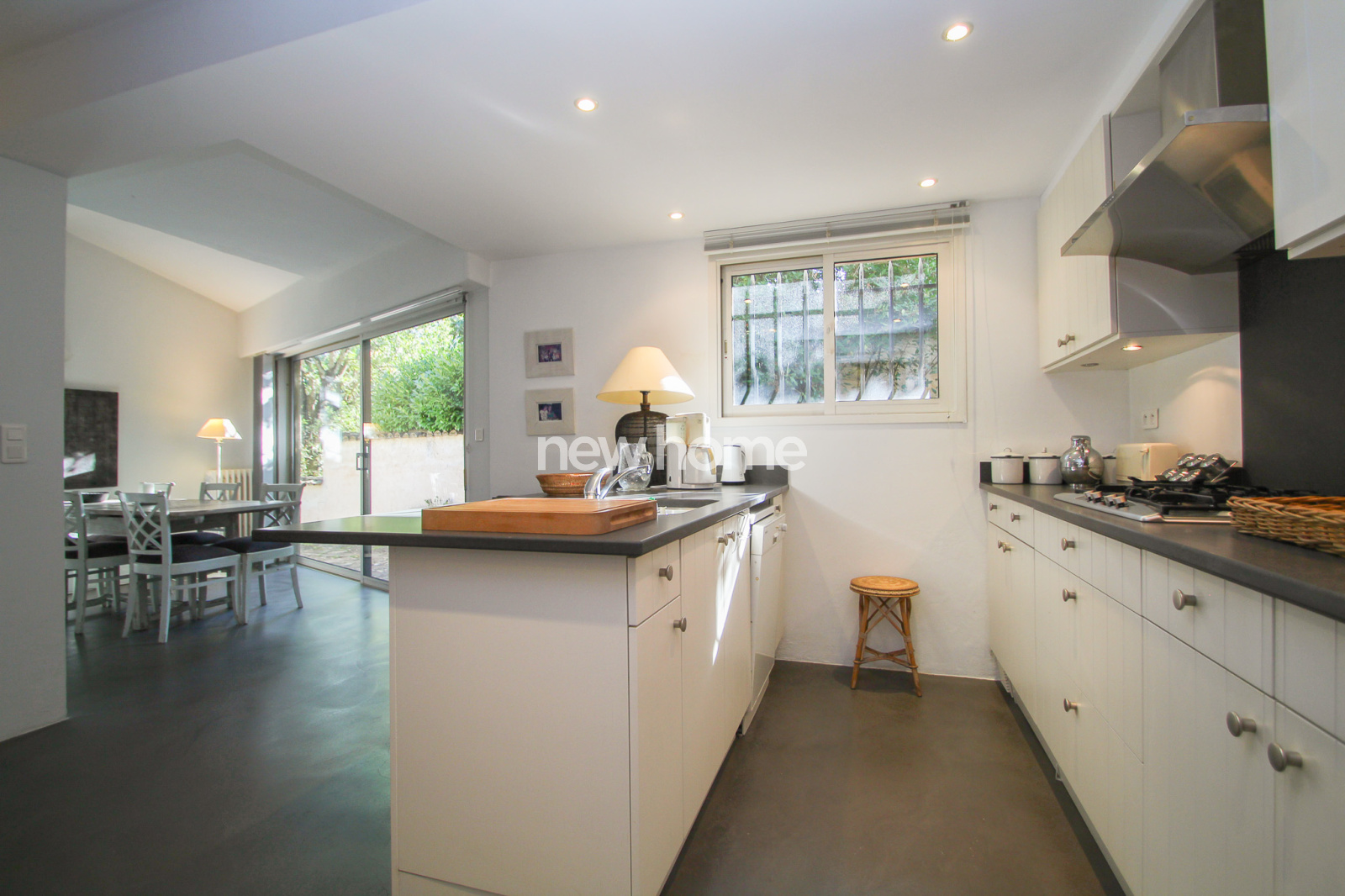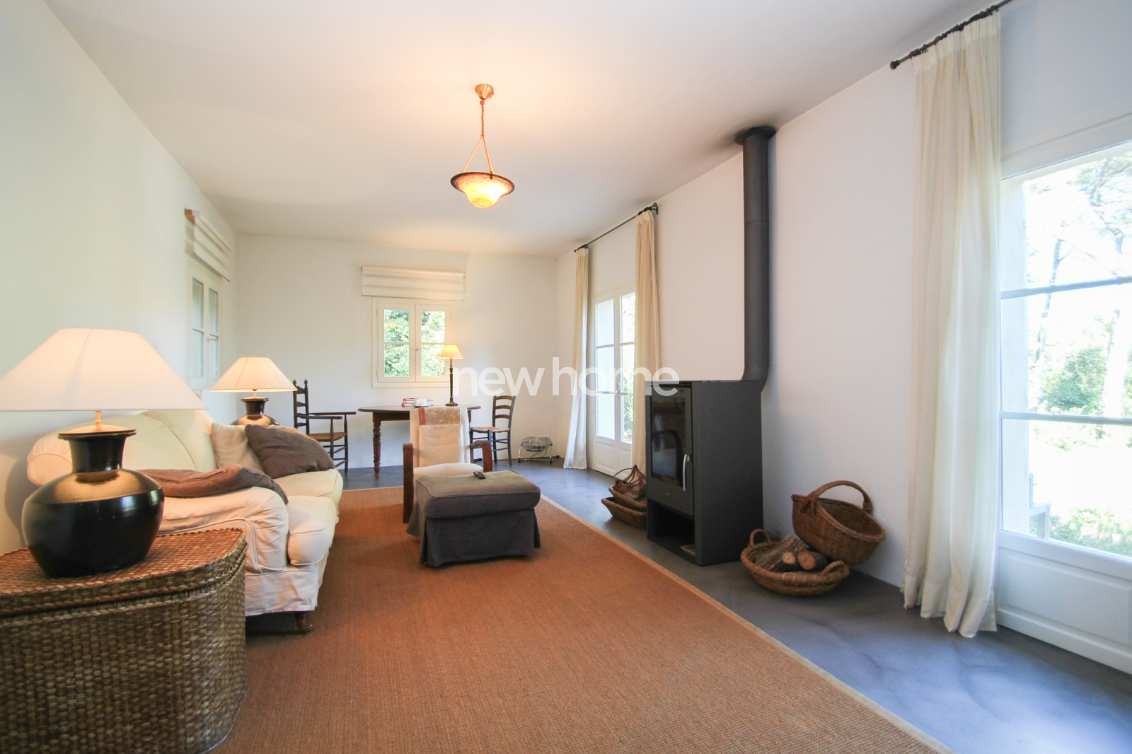 La maison présente une disposition ludique avec plusieurs petits niveaux. Elle comprend une grande cuisine, une salle à manger et un salon confortable avec une cheminée. Quelques marches en contrebas du salon mènent à un second salon offrant une vue sur le jardin et des portes-fenêtres donnant sur la terrasse.
