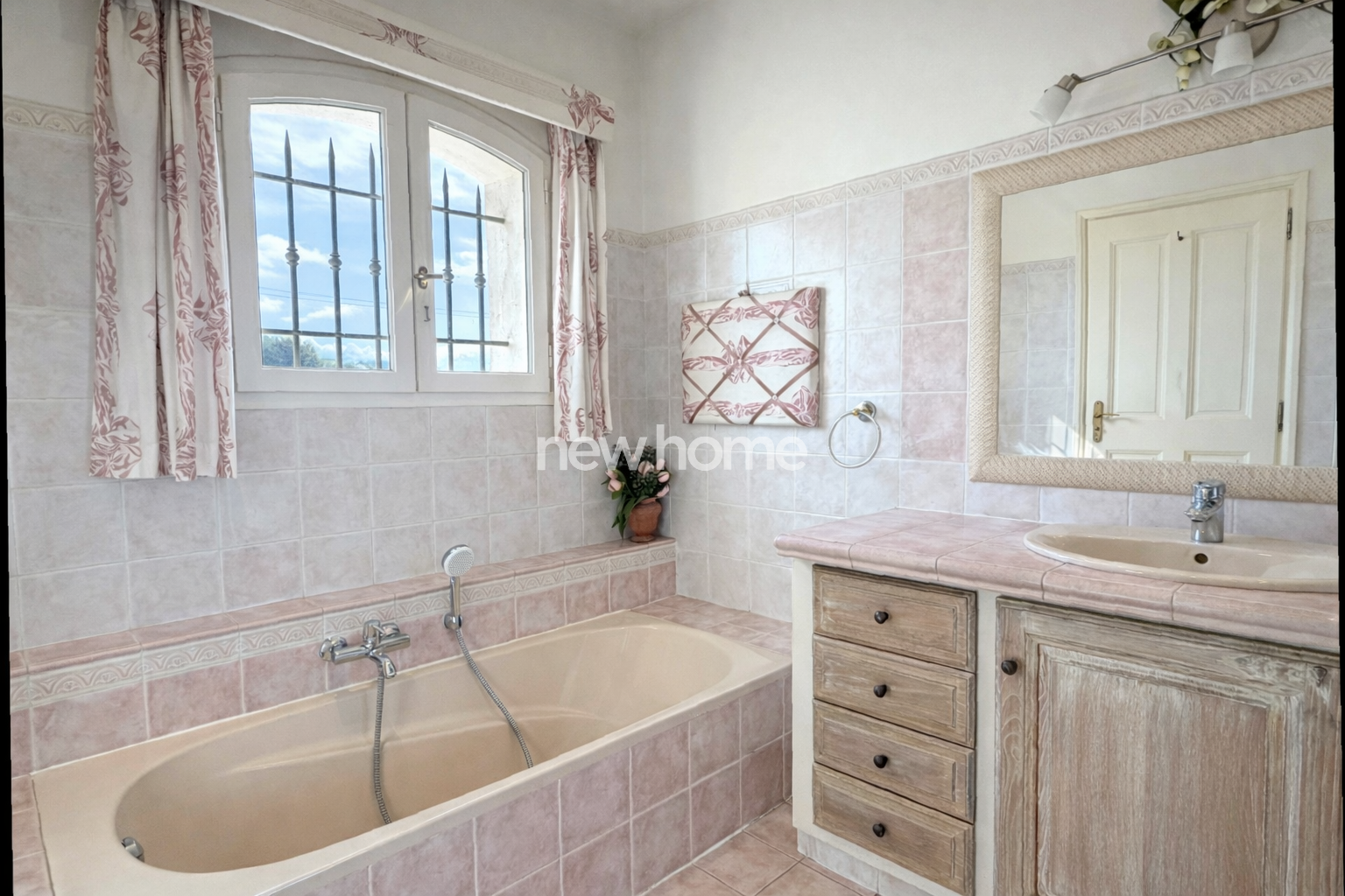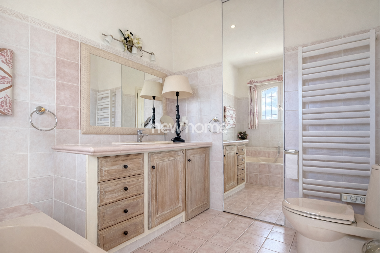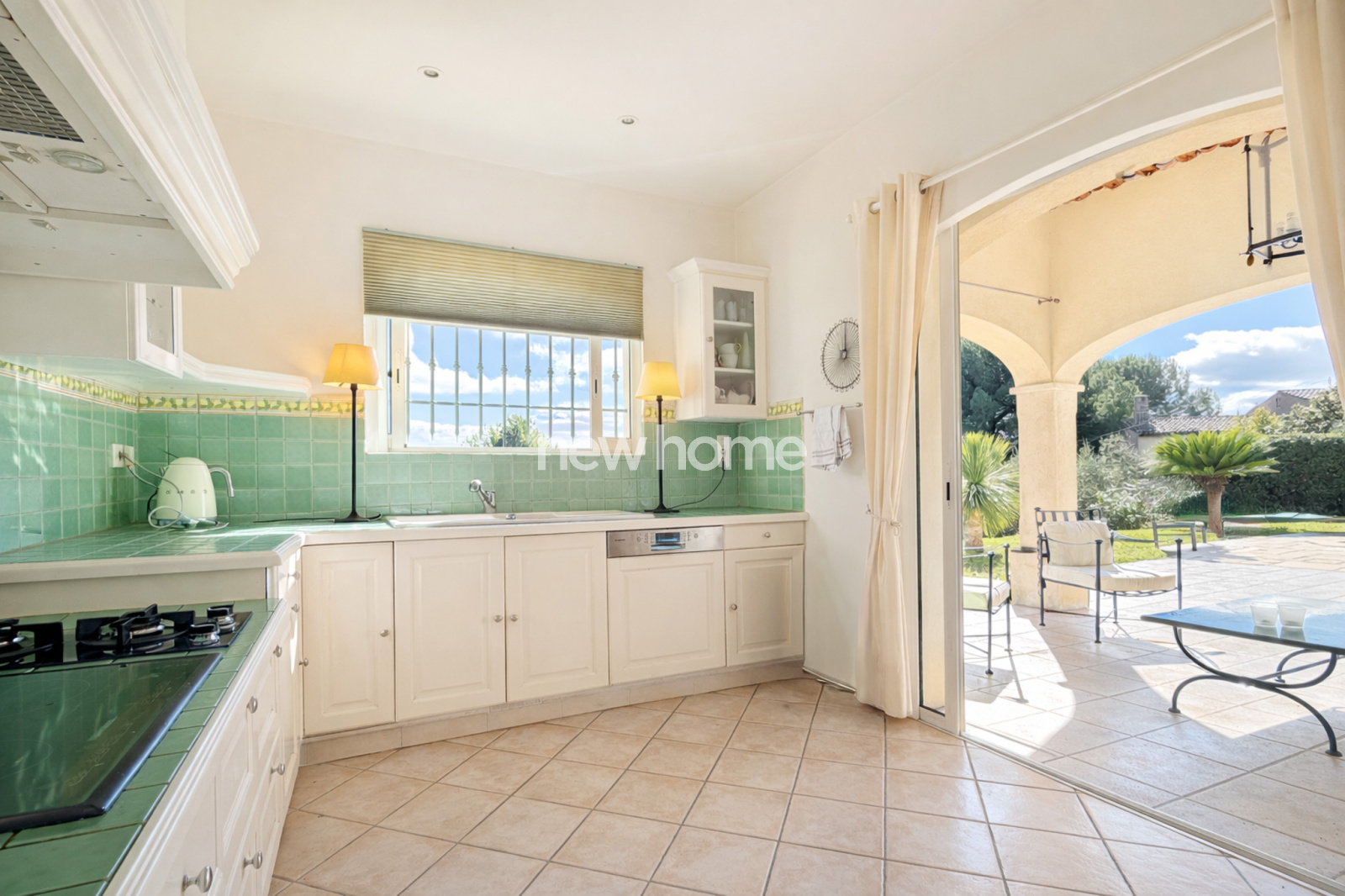 La cuisine spacieuse s’ouvre directement sur la terrasse et la piscine, parfaite pour profiter pleinement du climat méditerranéen. Une grande buanderie, un double garage ainsi que plusieurs terrasses complètent l’ensemble.