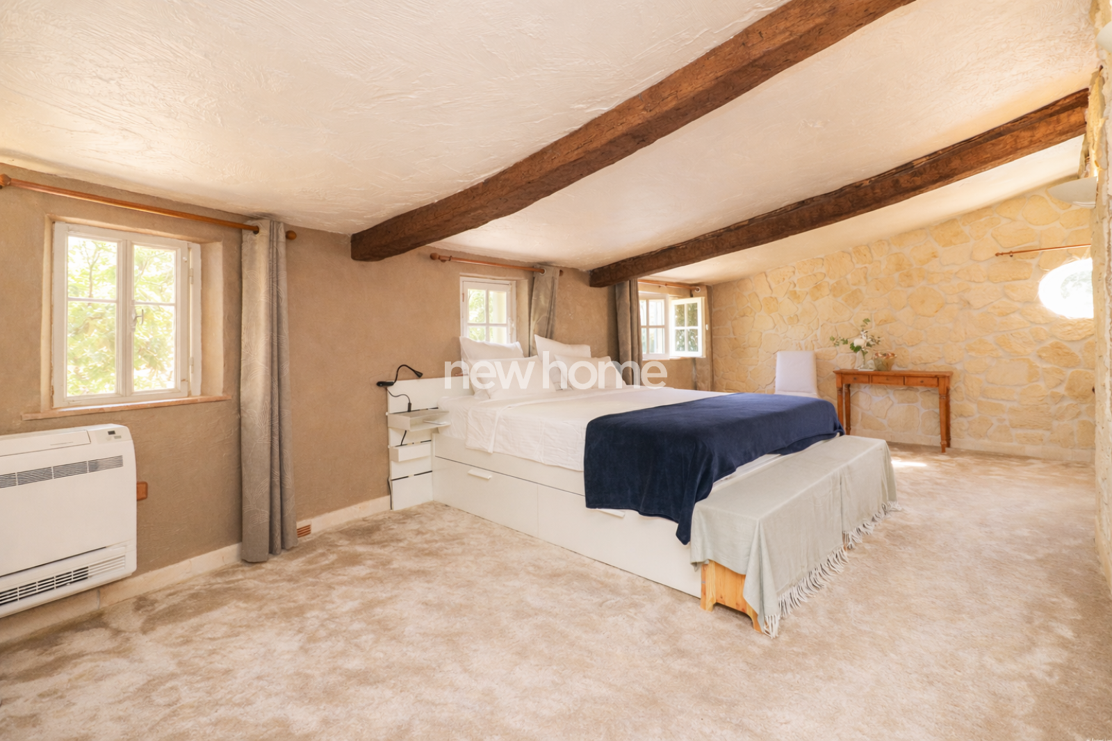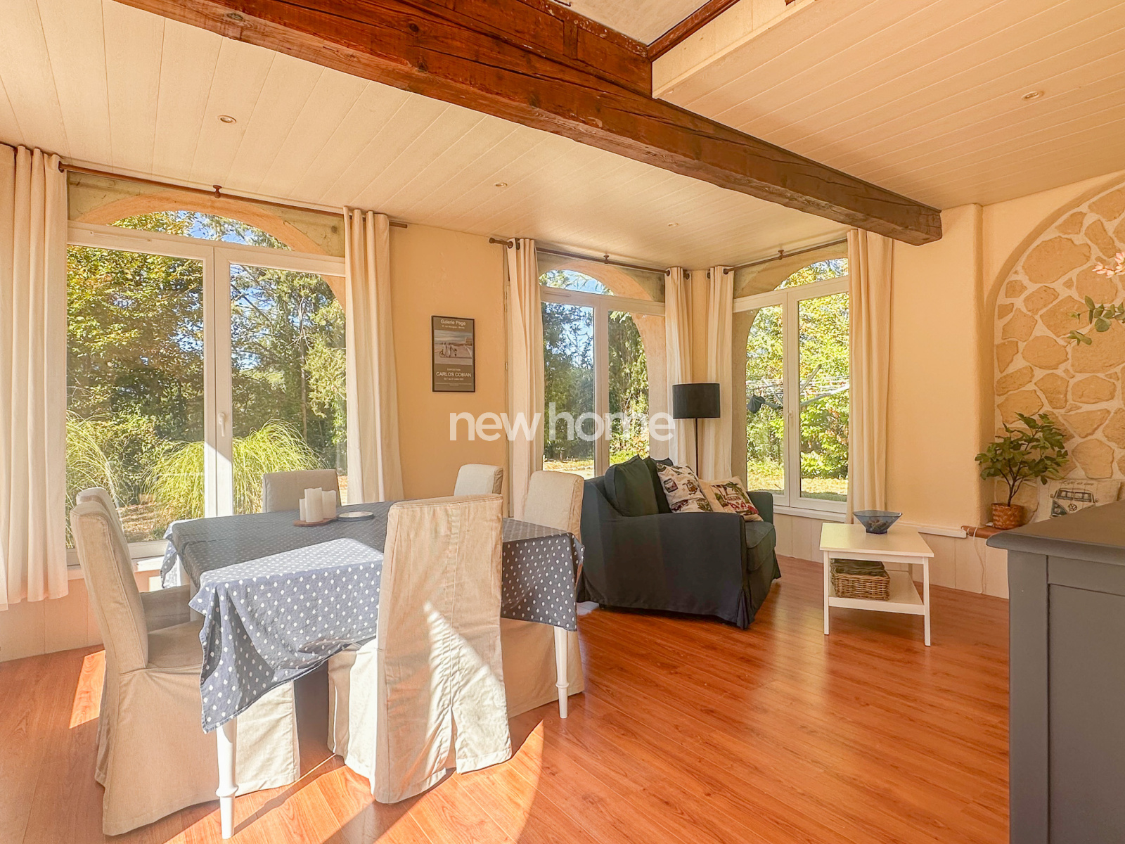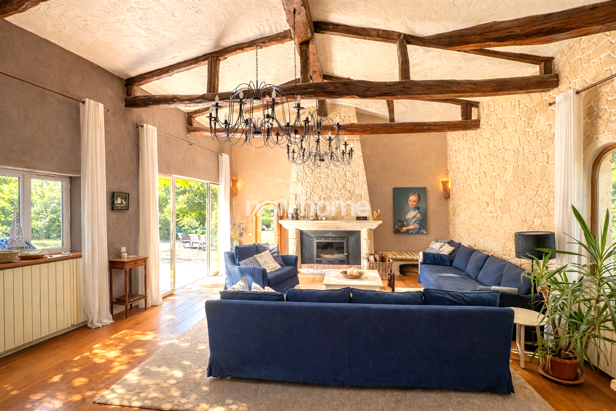 Au rez-de-chaussée, la maison offre un spacieux salon avec de beaux volumes, de hauts plafonds et de magnifiques poutres apparentes, une cuisine aménagée et équipée ouvrant sur une terrasse couverte de 27 m², deux chambres, un grand bureau, une salle de bains ainsi qu’un WC invités.