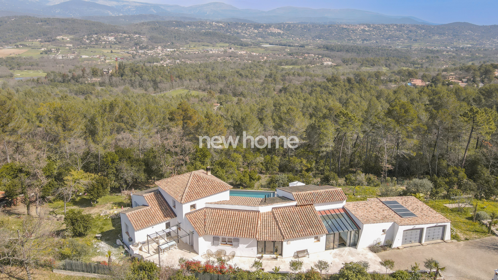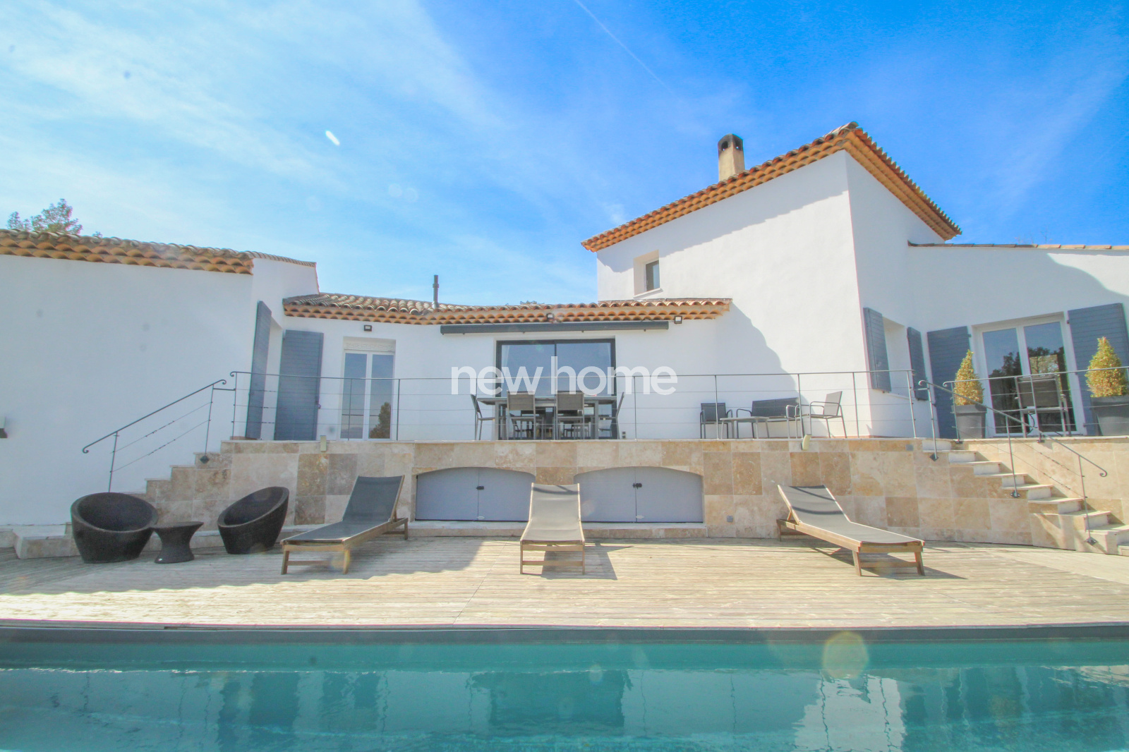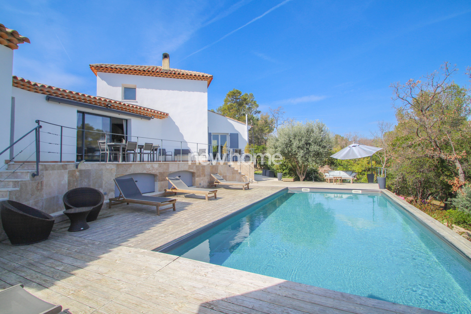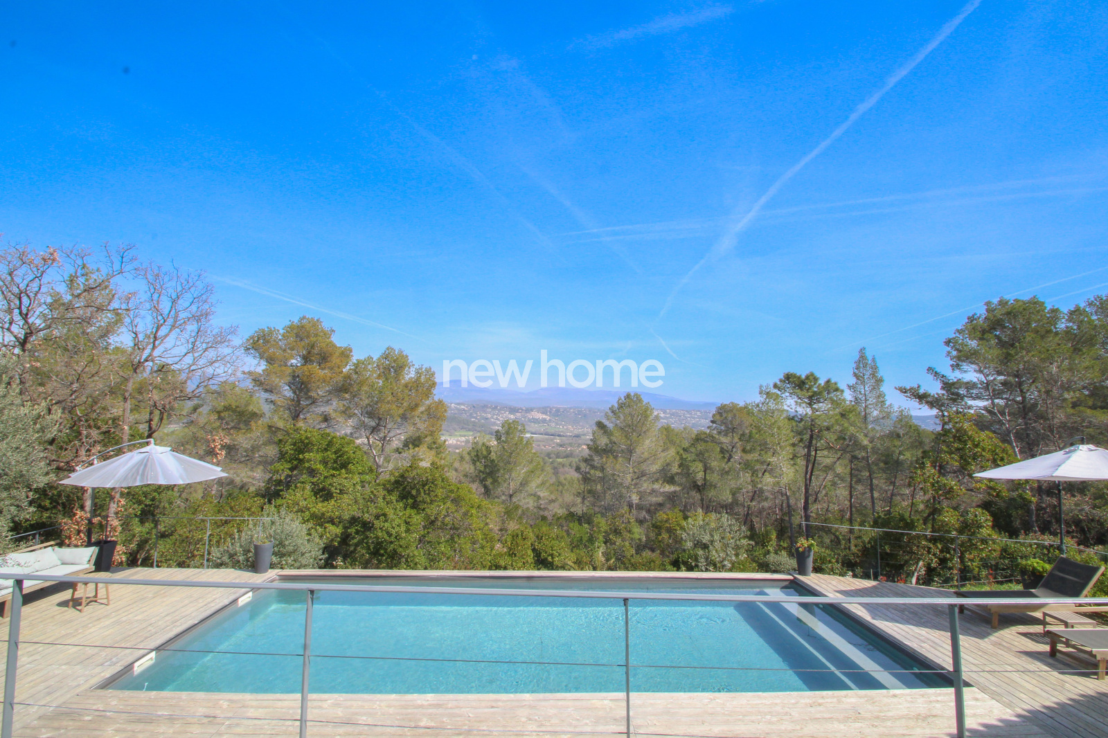 Tourrettes (83440)À seulement 5 minutes du renommé parcours de golf de Terre Blanche à Tourrettes, vous trouverez cette magnifique villa moderne entièrement rénovée offrant une vue panoramique sur les villages de Tourrettes et de Fayence, avec les montagnes des Préalpes en toile de fond. La villa est principalement de plain-pied, à l'exception de la mezzanine, et a été rénovée avec goût en utilisant des matériaux de haute qualité. En entrant, vous êtes accueillis par la salle à manger et la cuisine ouverte, toutes deux offrant des vues panoramiques époustouflantes à travers les portes coulissantes en verre donnant sur la terrasse. La cuisine donne également accès à la terrasse de l'autre côté de la maison. Le salon, confortable et intime, dispose d'une cheminée. Un escalier en colimaçon mène à la mezzanine, actuellement utilisée comme espace bureau. De ce côté de la maison, vous trouverez deux chambres, chacune avec sa salle d'eau et des portes coulissantes donnant sur leur propre terrasse. De l'autre côté de la villa, il y a une troisième chambre et une salle de bains avec douche et toilettes, ainsi que la chambre principale avec un dressing et une salle de bains équipée à la fois d'une baignoire, d'une douche et de toilettes. Ces chambres ont également accès à la terrasse. Une loggia avec un toit en verre et une façade en verre permet de profiter du soleil du sud de la France même pendant les mois d'hiver. À côté de la maison se trouve un garage double accessible de l'intérieur, et il y a deux points de recharge pour voitures électriques sur le vaste parking. Depuis la piscine (10x5m) et la terrasse, vous profiterez d'une vue imprenable sur les environs. En résumé, une maison charmante adaptée à la fois à une résidence permanente et à une résidence de vacances.