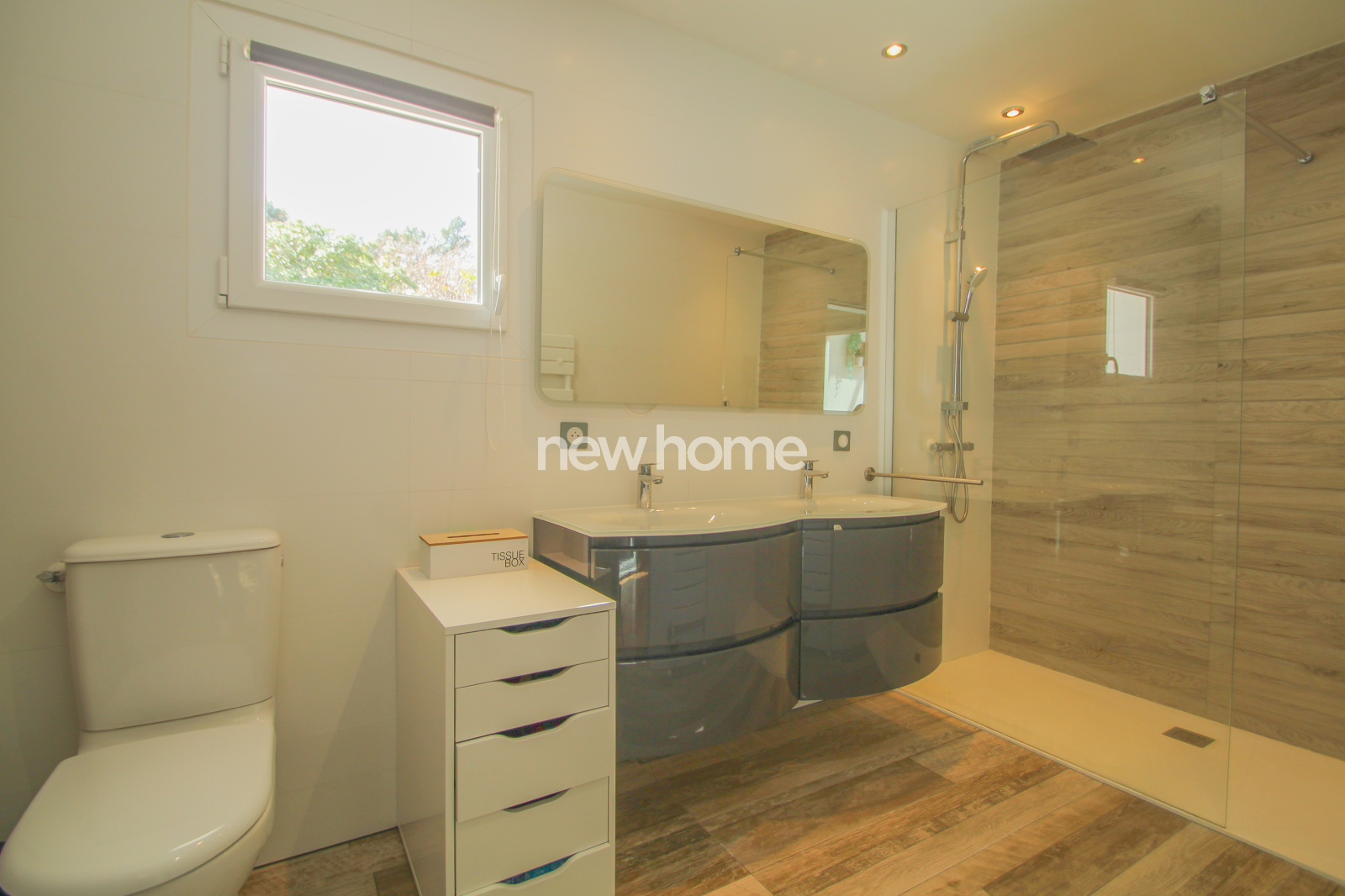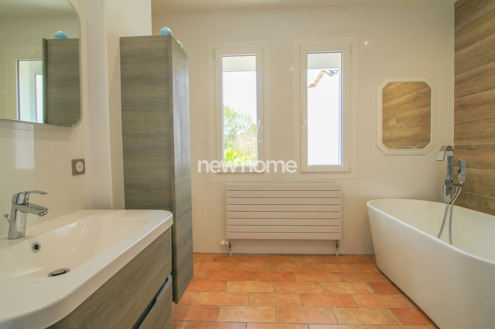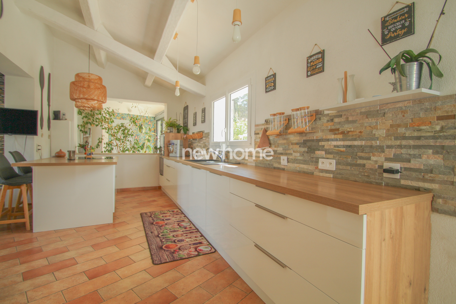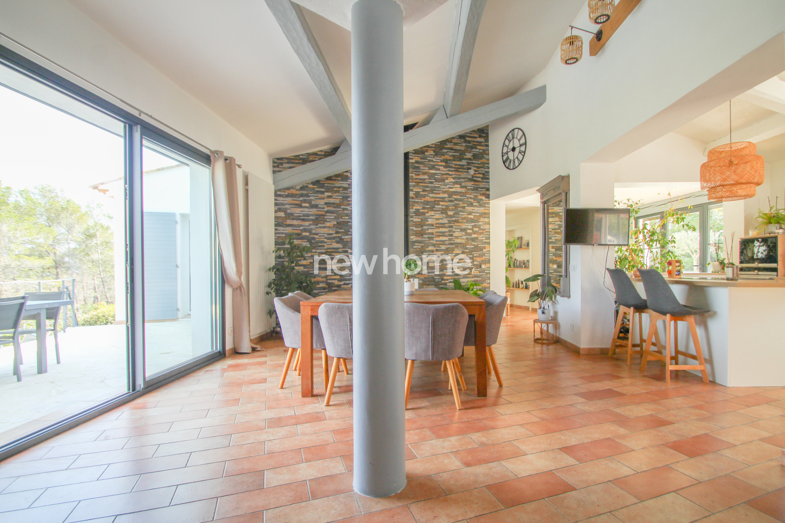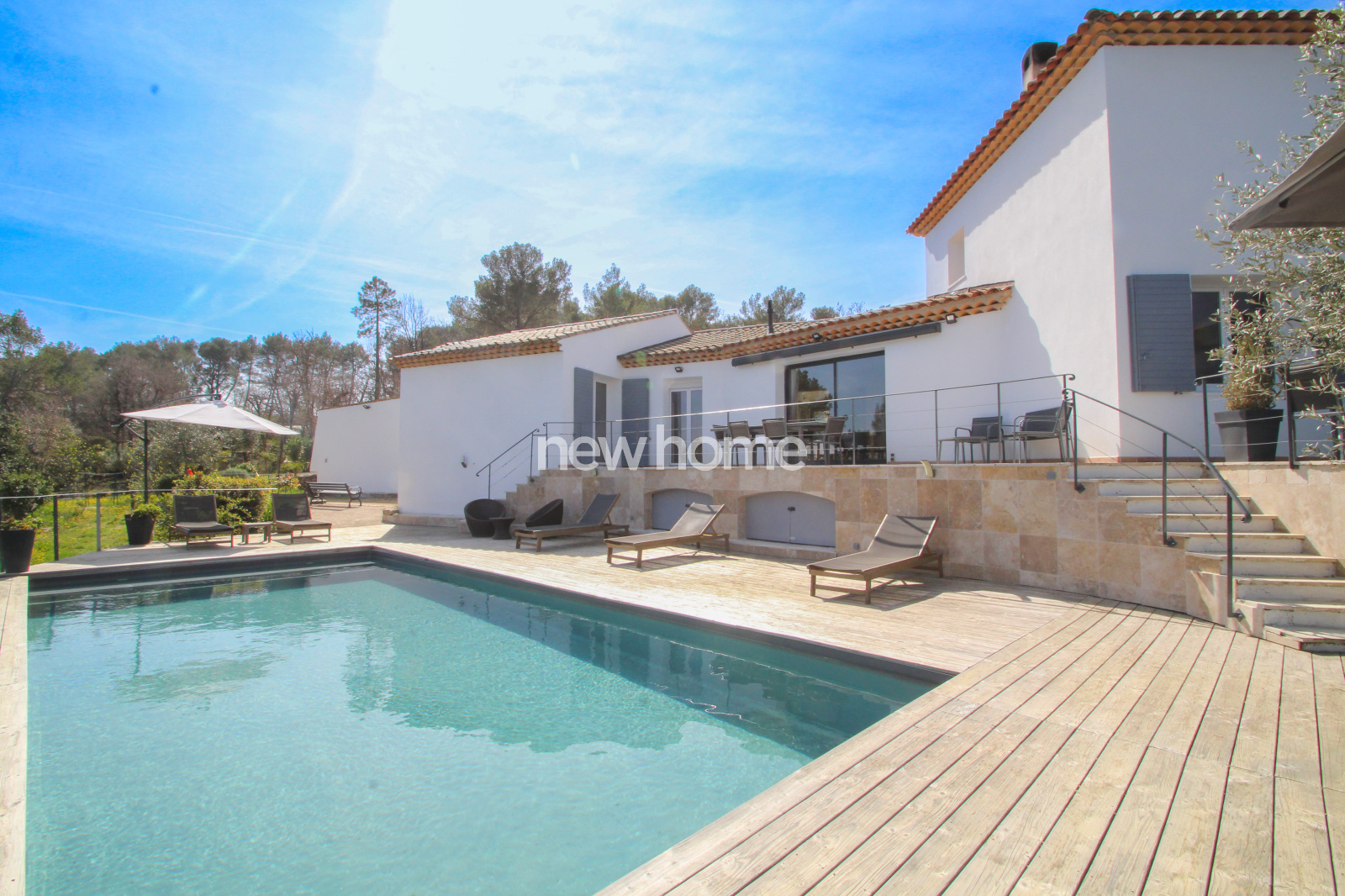 Tourrettes (83440)À seulement 5 minutes du renommé parcours de golf de Terre Blanche à Tourrettes, vous trouverez cette magnifique villa moderne entièrement rénovée offrant une vue panoramique sur les villages de Tourrettes et de Fayence, avec les montagnes des Préalpes en toile de fond. La villa est principalement de plain-pied, à l'exception de la mezzanine, et a été rénovée avec goût en utilisant des matériaux de haute qualité. En entrant, vous êtes accueillis par la salle à manger et la cuisine ouverte, toutes deux offrant des vues panoramiques époustouflantes à travers les portes coulissantes en verre donnant sur la terrasse. La cuisine donne également accès à la terrasse de l'autre côté de la maison. Le salon, confortable et intime, dispose d'une cheminée. Un escalier en colimaçon mène à la mezzanine, actuellement utilisée comme espace bureau. De ce côté de la maison, vous trouverez deux chambres, chacune avec sa salle d'eau et des portes coulissantes donnant sur leur propre terrasse. De l'autre côté de la villa, il y a une troisième chambre et une salle de bains avec douche et toilettes, ainsi que la chambre principale avec un dressing et une salle de bains équipée à la fois d'une baignoire, d'une douche et de toilettes. Ces chambres ont également accès à la terrasse. Une loggia avec un toit en verre et une façade en verre permet de profiter du soleil du sud de la France même pendant les mois d'hiver. À côté de la maison se trouve un garage double accessible de l'intérieur, et il y a deux points de recharge pour voitures électriques sur le vaste parking. Depuis la piscine (10x5m) et la terrasse, vous profiterez d'une vue imprenable sur les environs. En résumé, une maison charmante adaptée à la fois à une résidence permanente et à une résidence de vacances.
