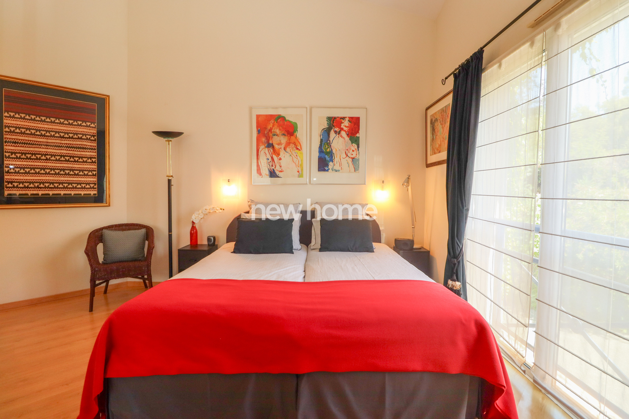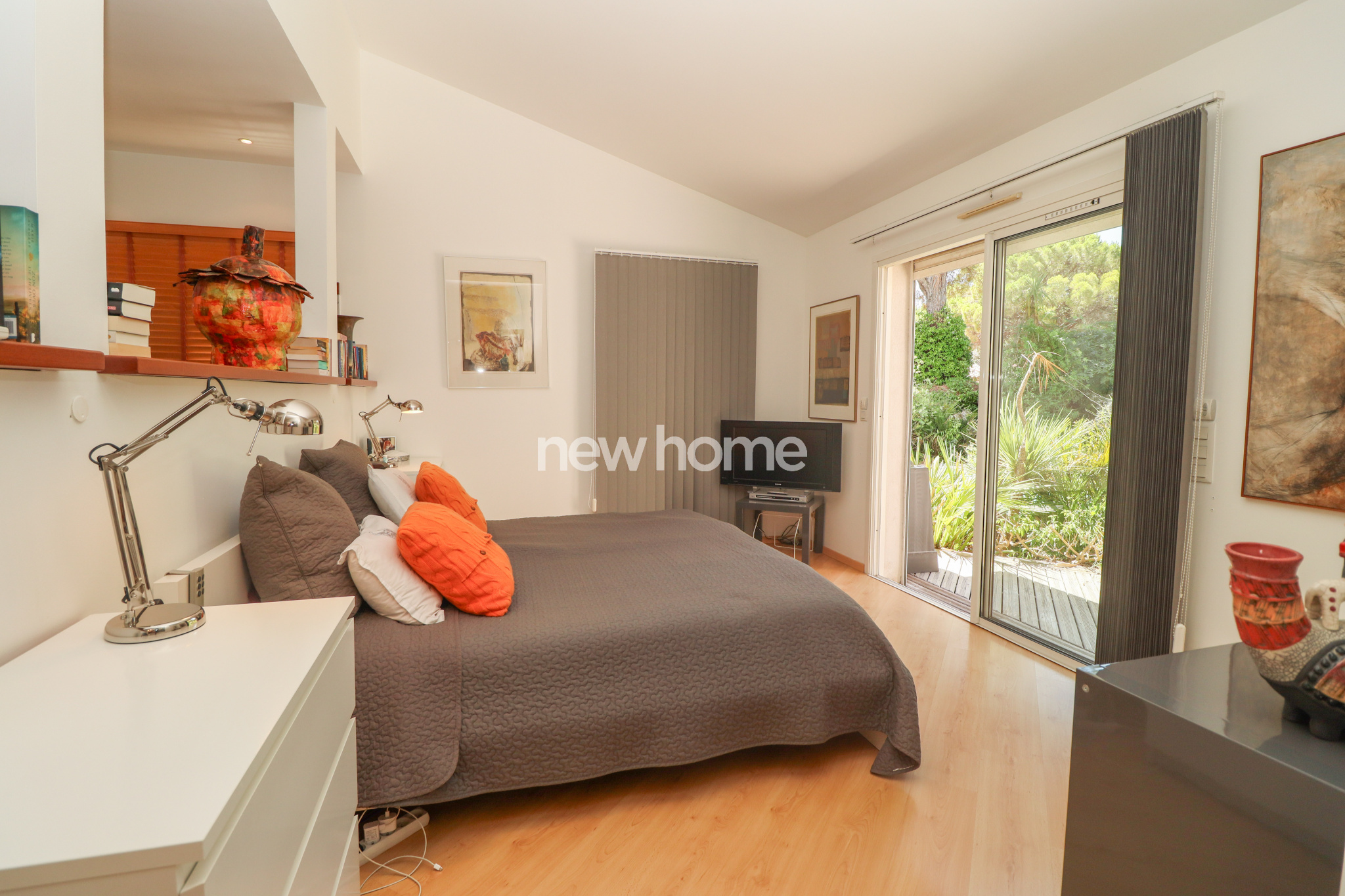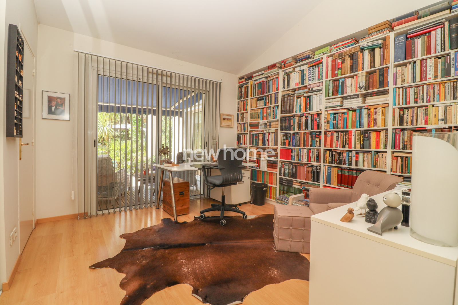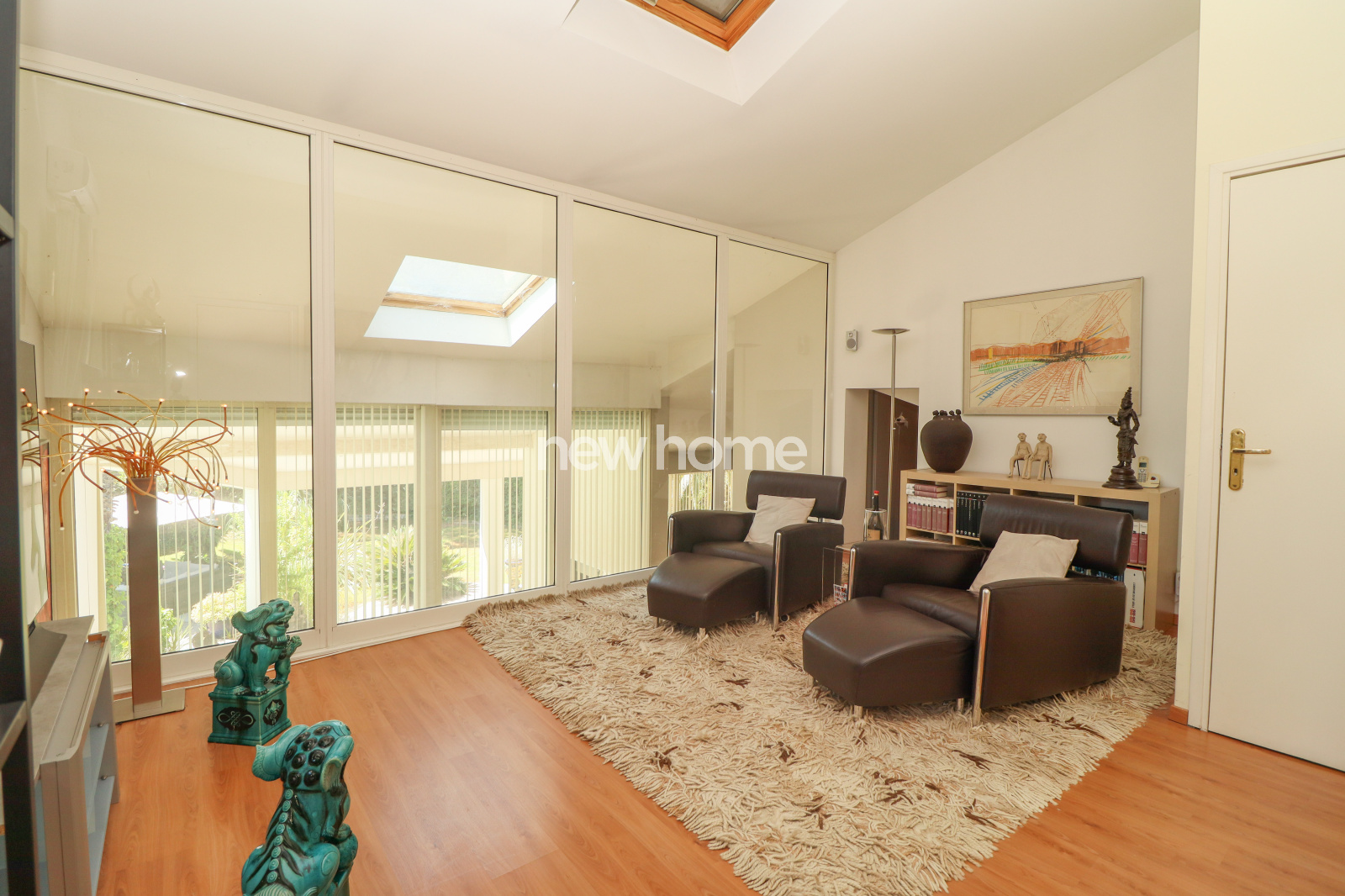 À l’étage, une mezzanine avec vitrage acoustique sert actuellement de salon TV et donne accès à un bureau en L, installé sous les toits.