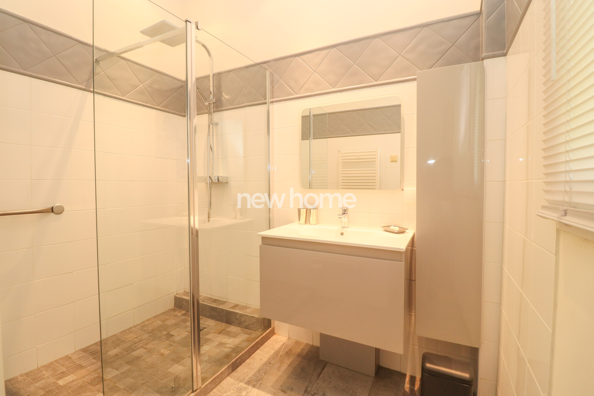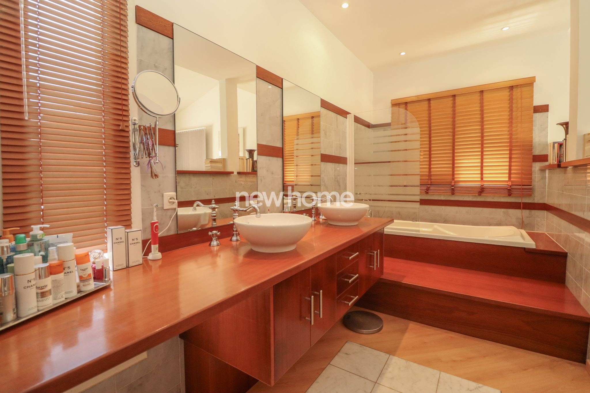 De plain-pied, vous trouverez la suite parentale avec salle de bains (jacuzzi) et WC séparé, ainsi que deux autres chambres, chacune avec leur propre salle d’eau et WC. Toutes les chambres disposent de grands placards intégrés et d’un accès direct vers l’extérieur.