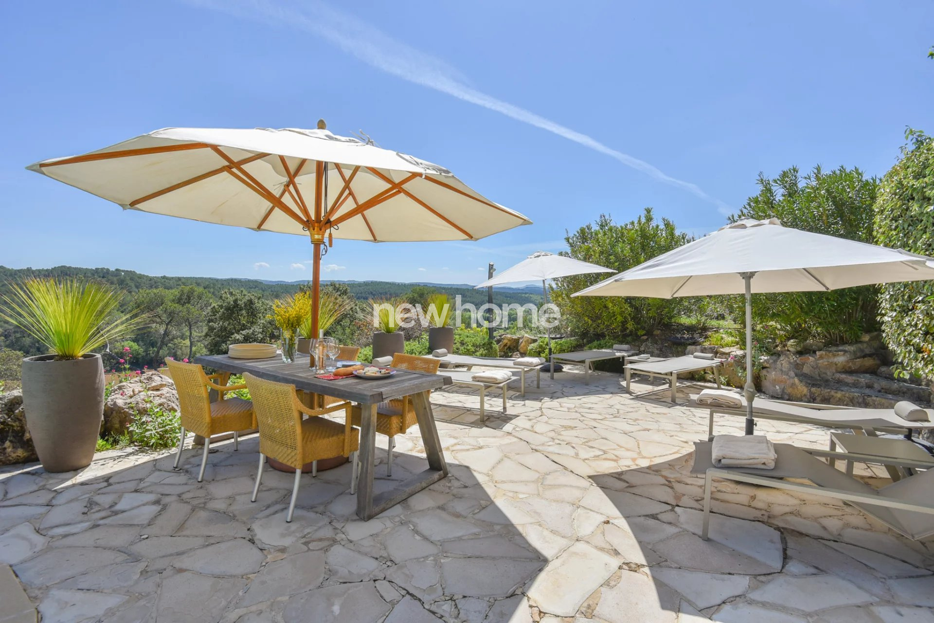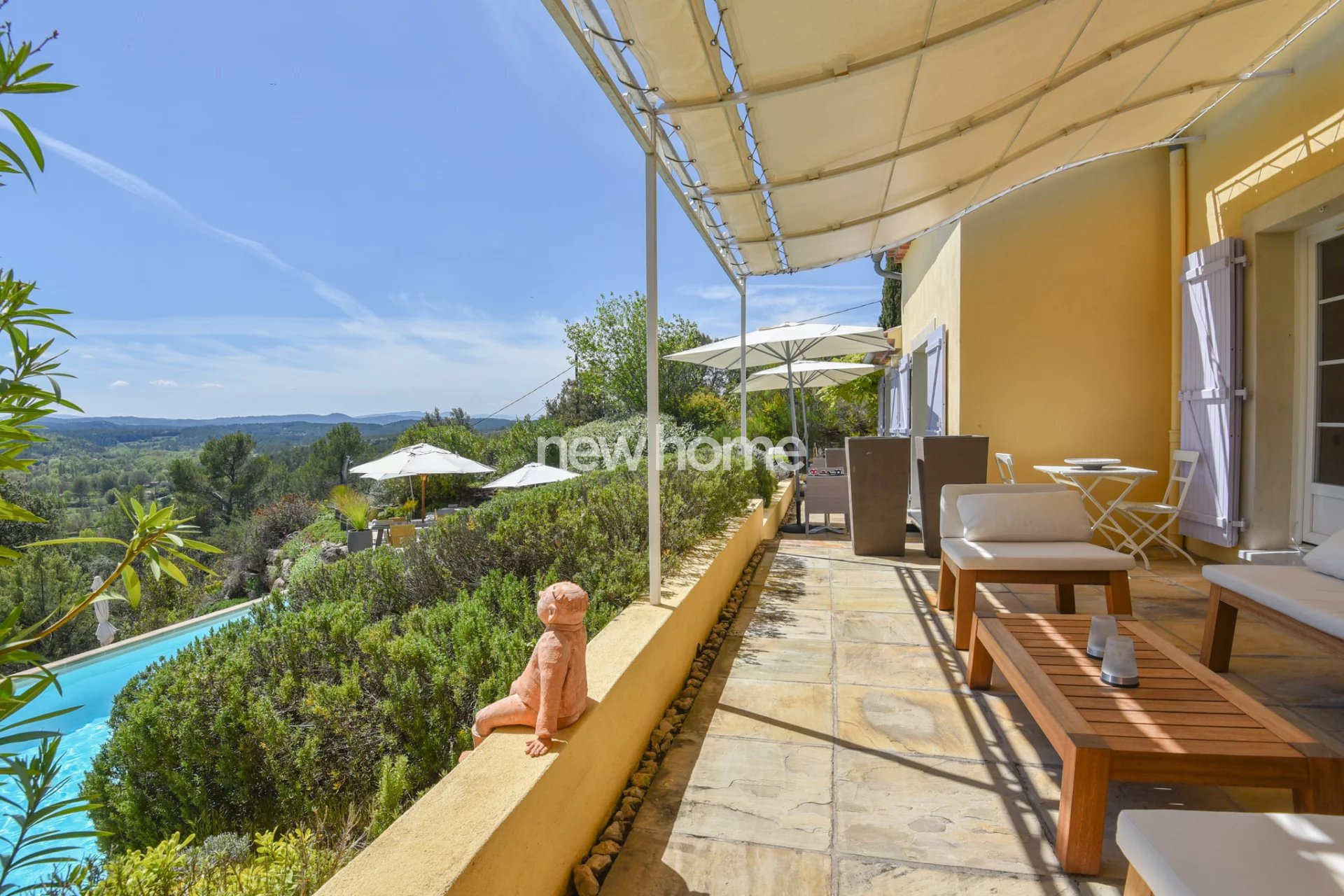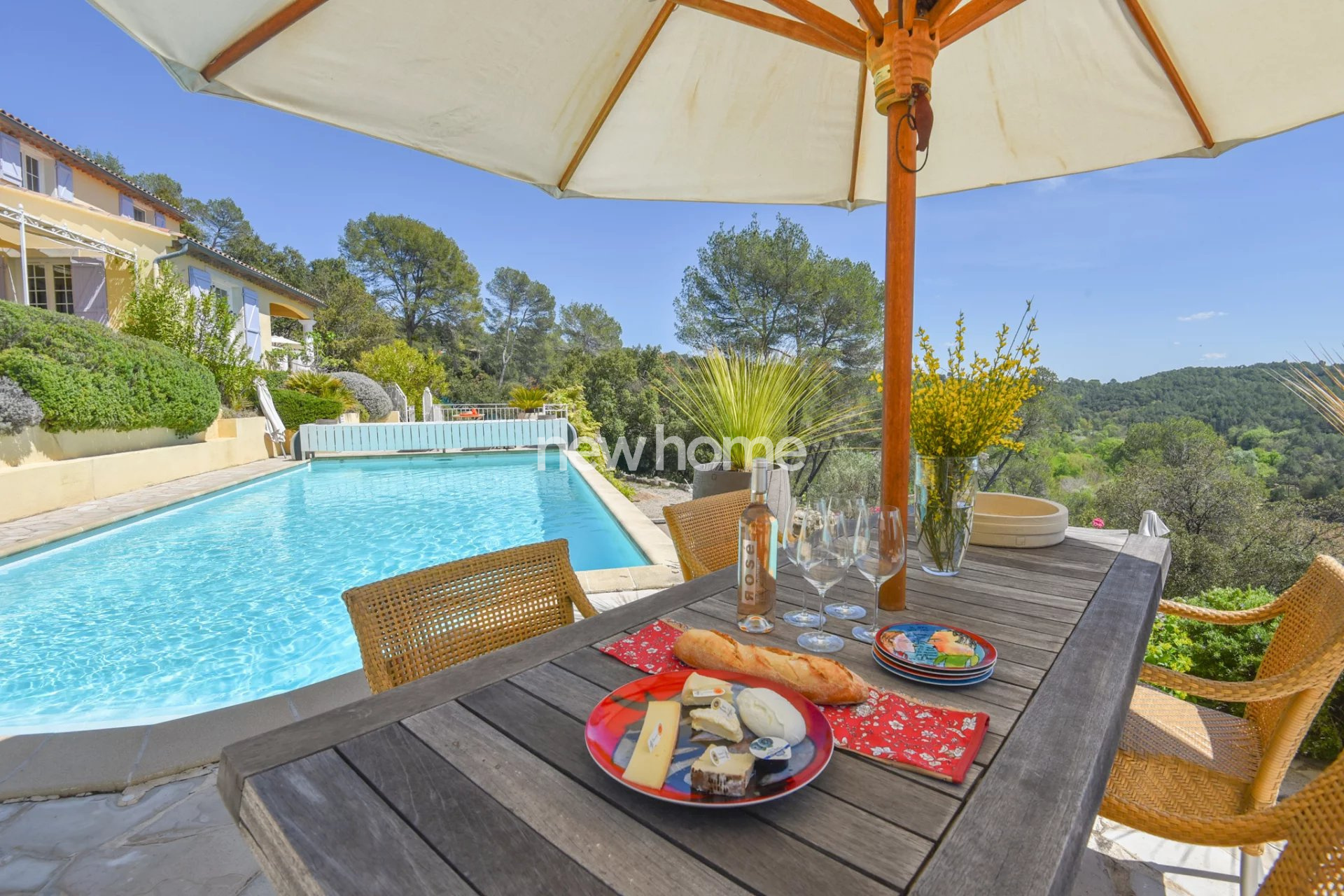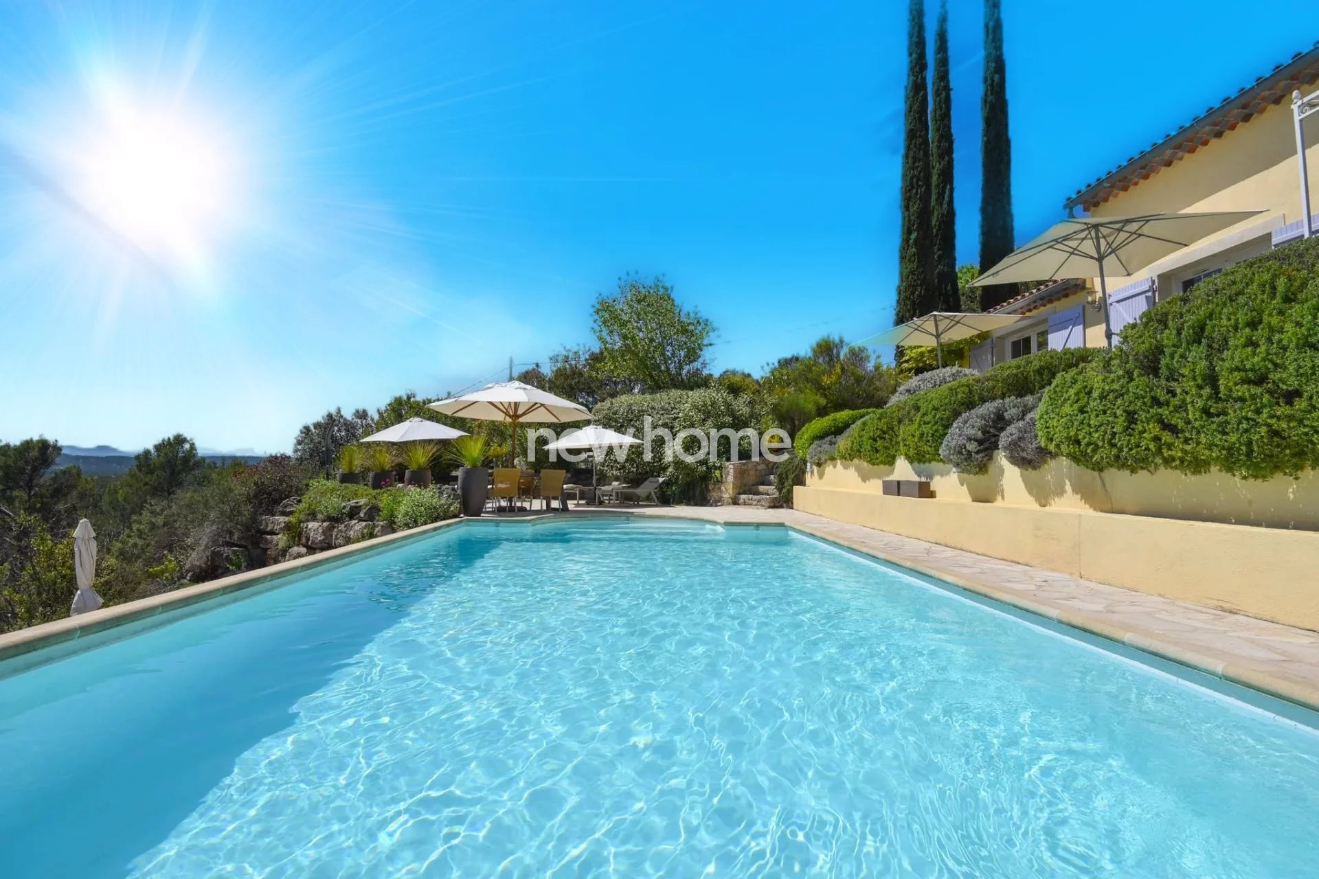 Entrecasteaux (83570)Très belle villa néo-provençale construite en 2003 et 2007 avec une architecture de style contemporaine. La villa demeure en excellent état et offre une vue panoramique sur les vignes et les collines environnantes. Elle se situe à pied du centre du village médiéval d'Entrecasteaux dans un quartier calme et sur un terrain en pente de 6250m². Elle dispose de 6 chambres (dont 5 avec climatisation), de 5 salles de bains, d'un spacieux salon très lumineux avec haut plafond et poêle à bois, d'une belle salle à manger (les 2 avec accès vers les terrasses couvertes), d'une cuisine haut de gamme moderne (double) entièrement équipée ainsi qu'une cave à vins bien agencée, d'une buanderie ainsi que d'un espace de stockage. Dans le beau jardin paysagé vous profiterez de la belle piscine chauffée (11x5) entourée par différentes terrasses offrant une vue superbe ainsi que du terrain de boules. Le propriété dispose de 2 portails d'entrée, d'un grand espace parking et d'un garage. Une maison idéale pour les vacances pafaitement adaptée pour une grande famille ! Beau potentiel pour la location également !